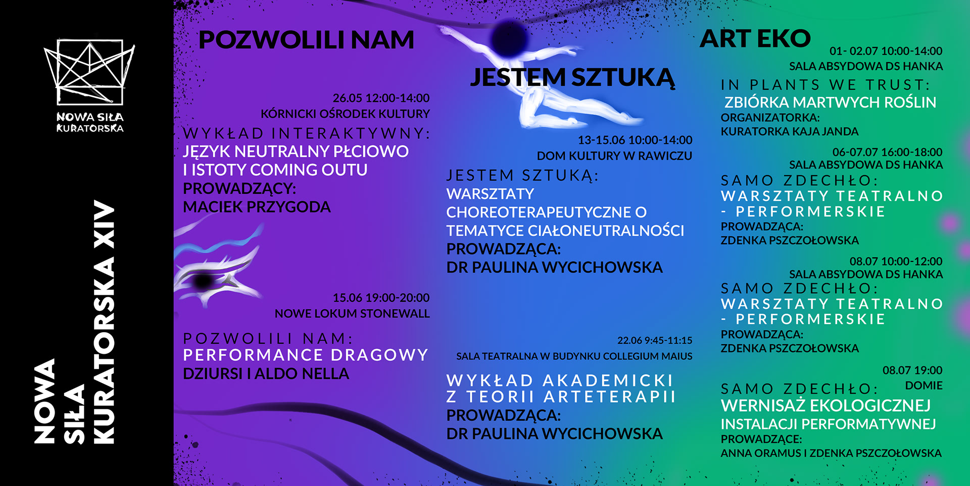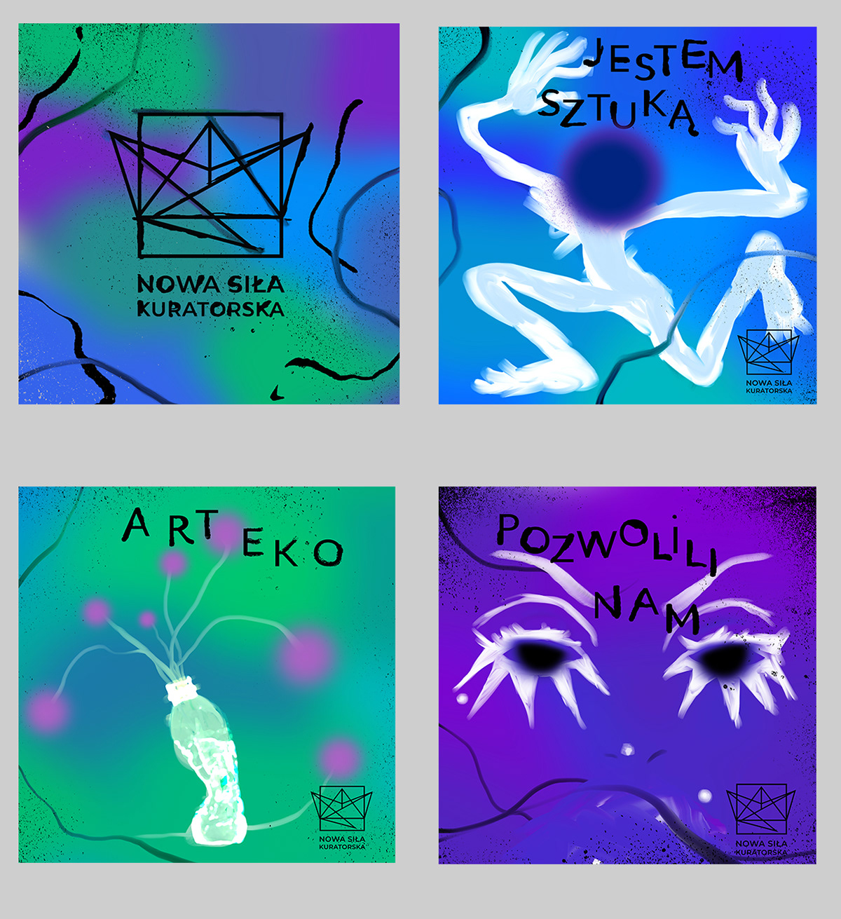 Nowa Siła Kuratorska to festiwal młodych osób kuratorujących działania kultury i sztuki. Stworzona identyfikacja graficzna XIV edycji oprawiała projekty przygotowane przez osoby studiujące na UAM dotykające takich tematów jak drag, sztuka ekologiczna i taniec.